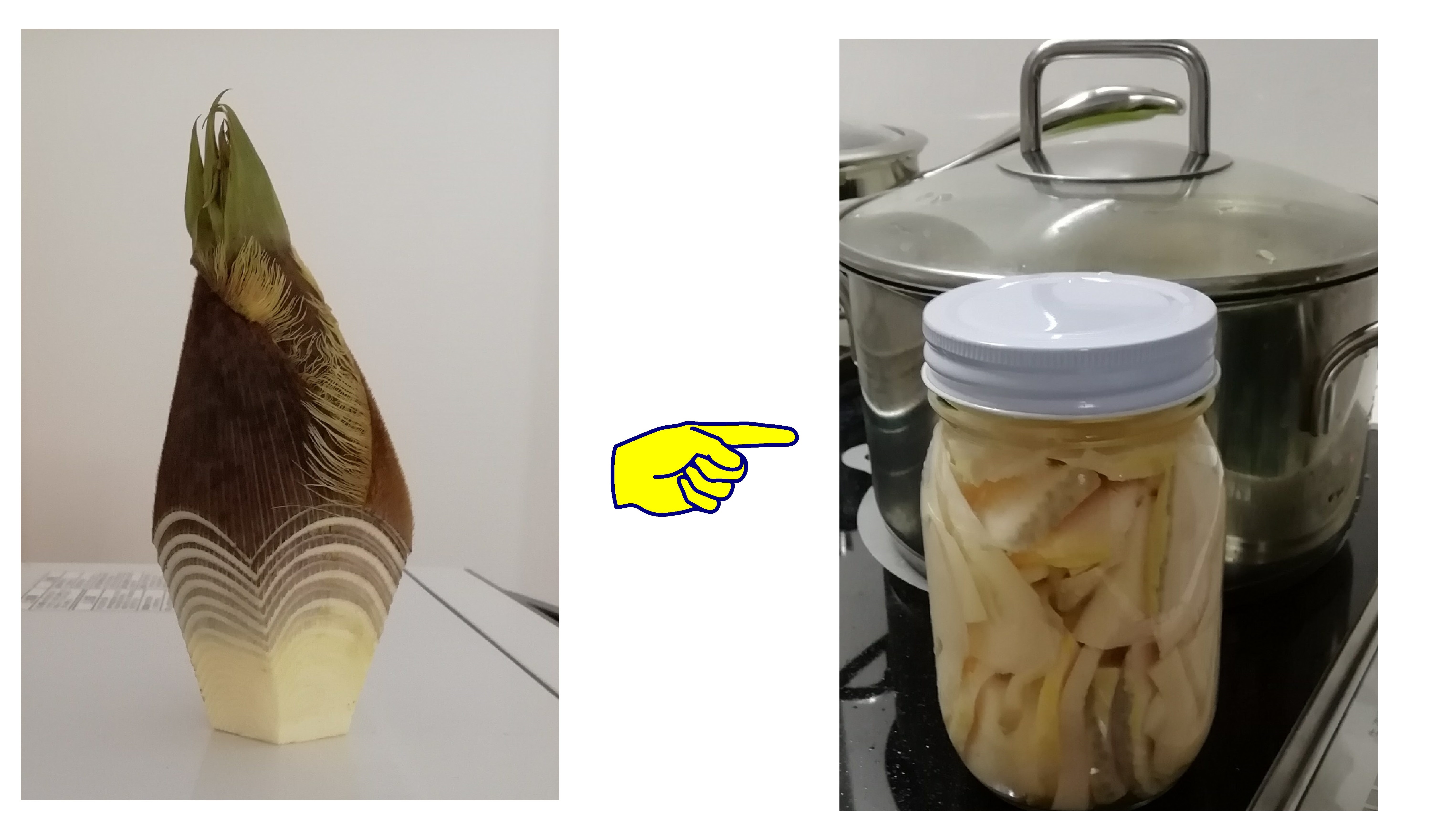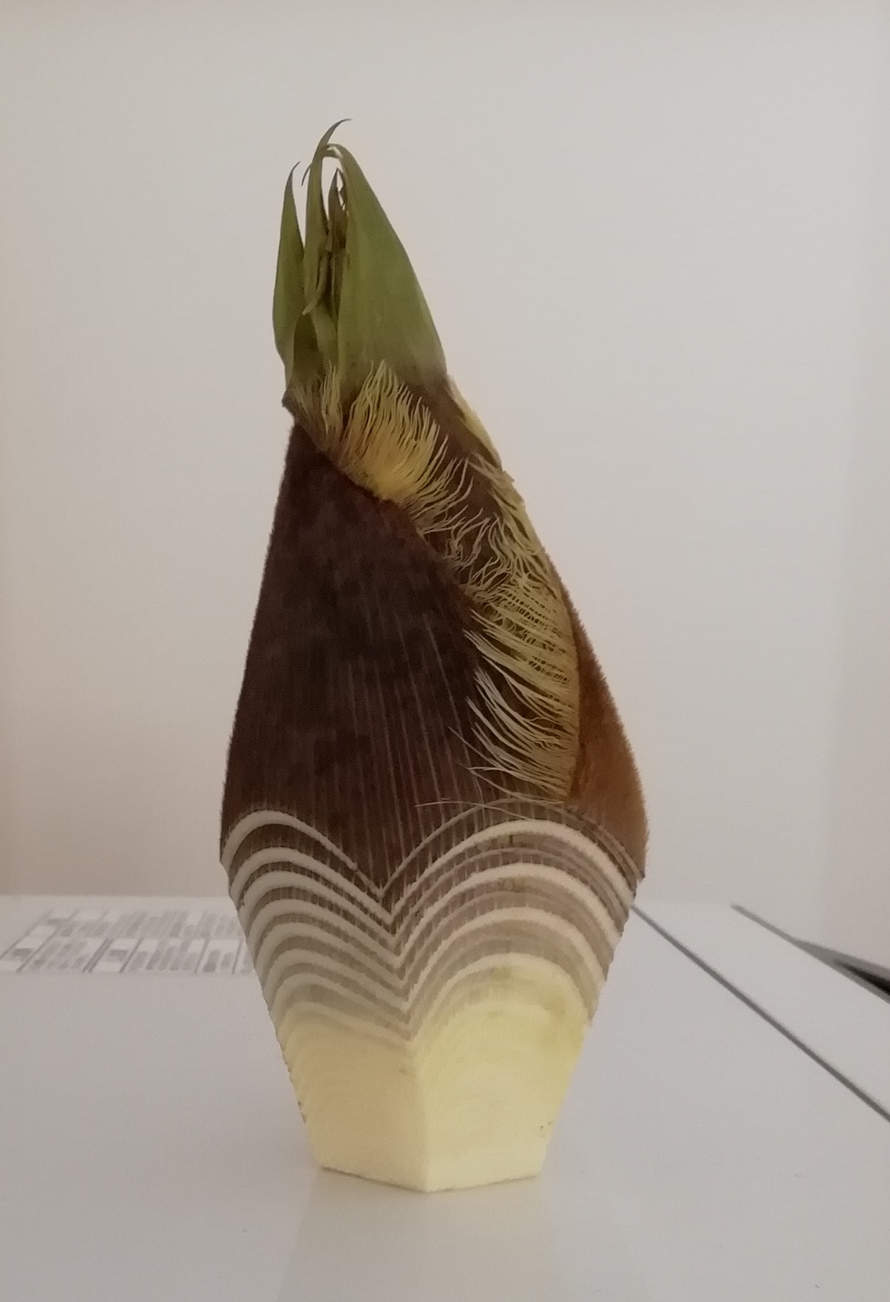 2024.4.5 電気ポットほどの孟宗だけを買ってきた。立派だったので頭の部分をデザインカットしてみた。