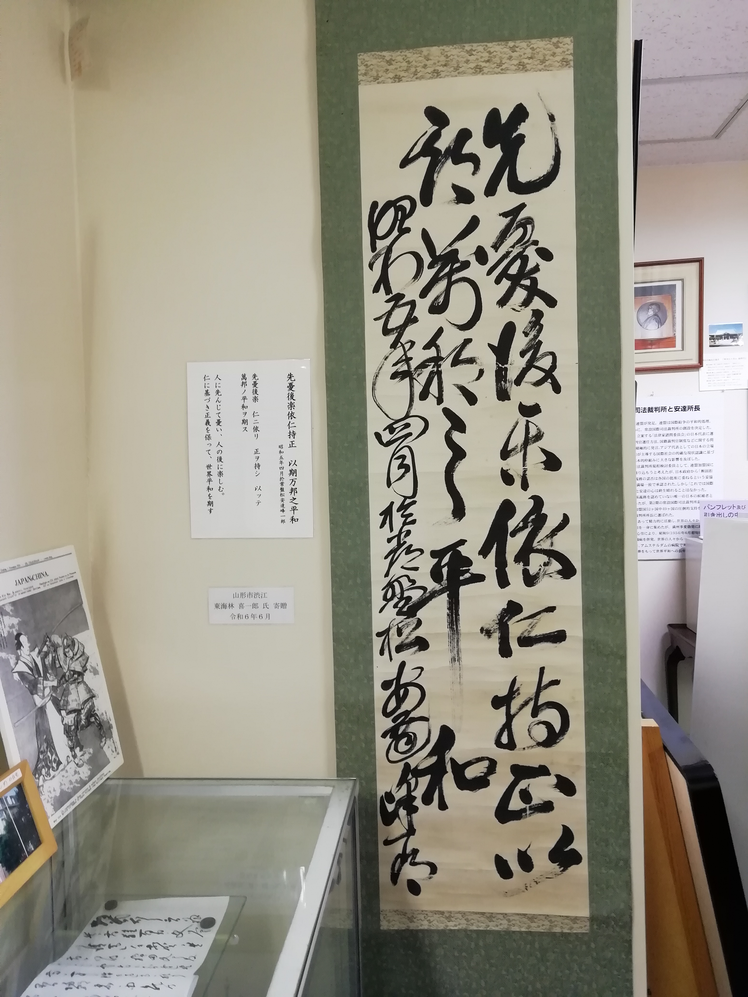 安達氏の書がありました。「先憂後楽依仁持正以期万邦乃平和」⇒憂いを先んじ楽(がく)を後にす。仁に依るが正を持つべし。これを期して万邦の平和とす。⇒安達氏が目指す平和の姿(様態)をあらわしたもの(決意)と理解しました。主語を「我」とするか、「ひと皆」とするかで、この書のスケールが天と地ほどの差がある。自分の生き方と対峙させる味わいのある書だった。